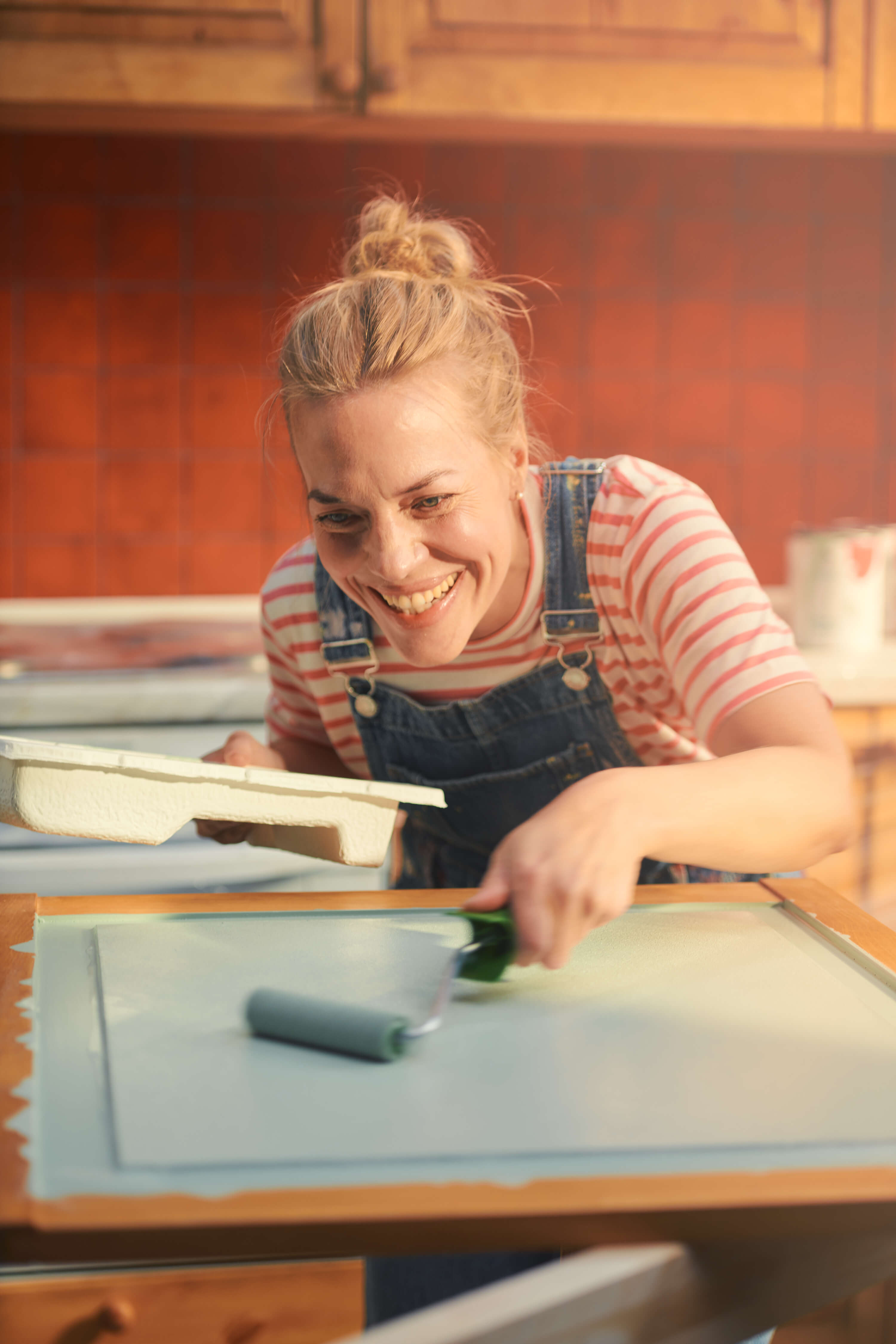 - Peins rapidement et de manière uniforme : utilise un pinceau pour les coins et les bords, et un rouleau pour les surfaces planes.
