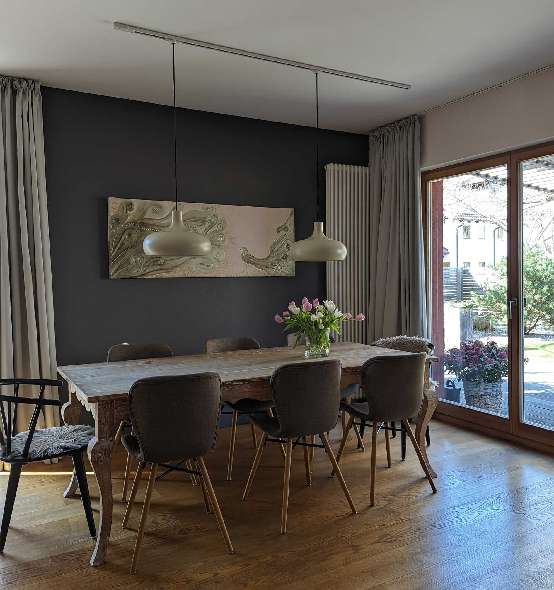 La peinture noire sur le mur absorbe tout d'abord une bonne partie de la lumière. En revanche, le noir fait briller toutes les autres couleurs de la pièce. Il ne faut pas sous-estimer l'effet noble de la Peinture Murale noire. Elle s'adapte aussi bien à un intérieur moderne qu'à une ambiance classique avec des antiquités.